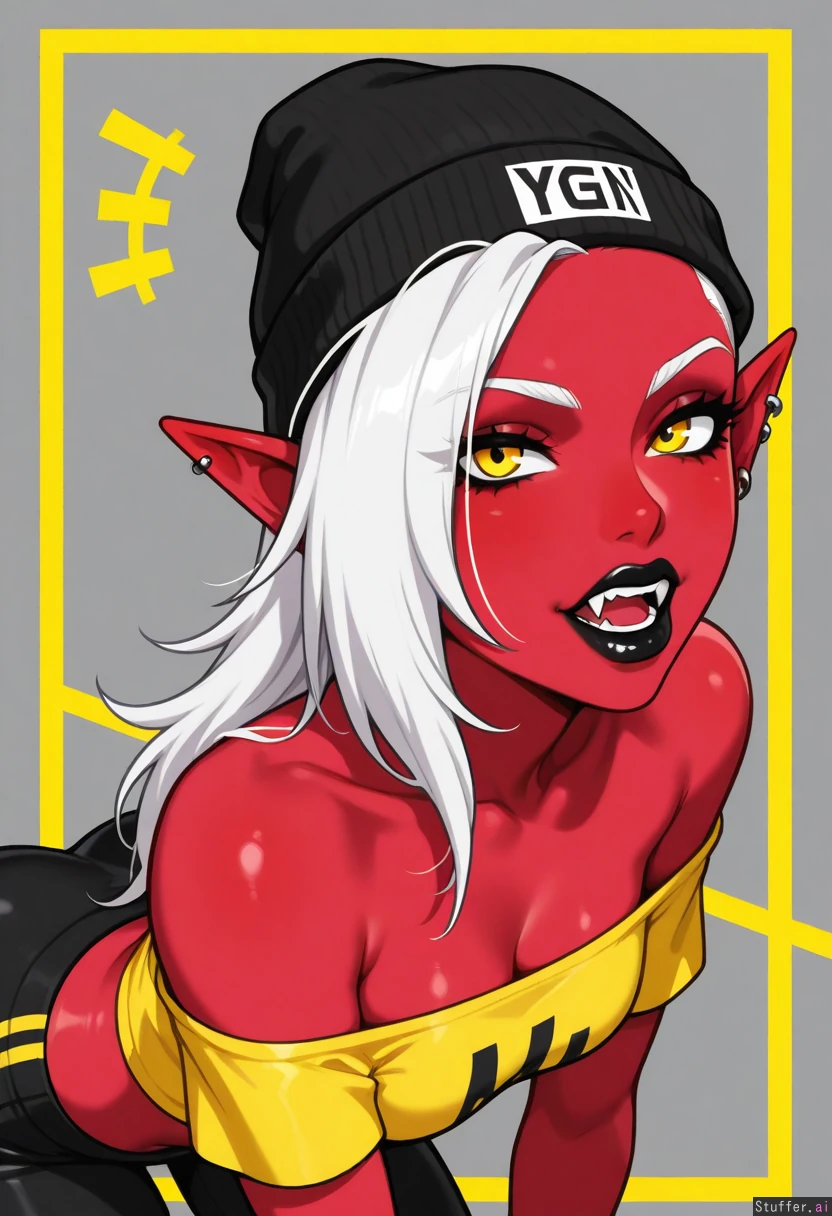 (( 1girl, solo, bushyspicy (artist) )) (( demon_girl, red_skin, big_lips, fangs_out, yellow_eyes, white_hair, sidecut, long_hair, black_lipstick, long_pointy_ears, ear_piercing)) (( Black_beanie, yellow_top, off-shoulder_top, strapless, black_yoga_pants))