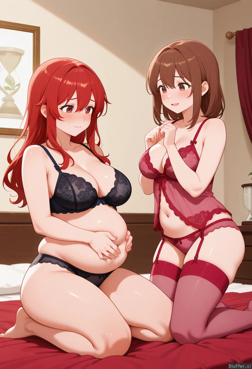 Lesbian_couple, yuri, Aroused, horny, Girl 1: the chubby one, red hair, lingerie, embarrassed with weight gain, ((chubby_belly:0.6)), ((bloated belly:0.4)), kneeling on bed, showing off, Girl 2: less chubby, brown_hair, hourglass, happy with girlfriend_ weight_gain,