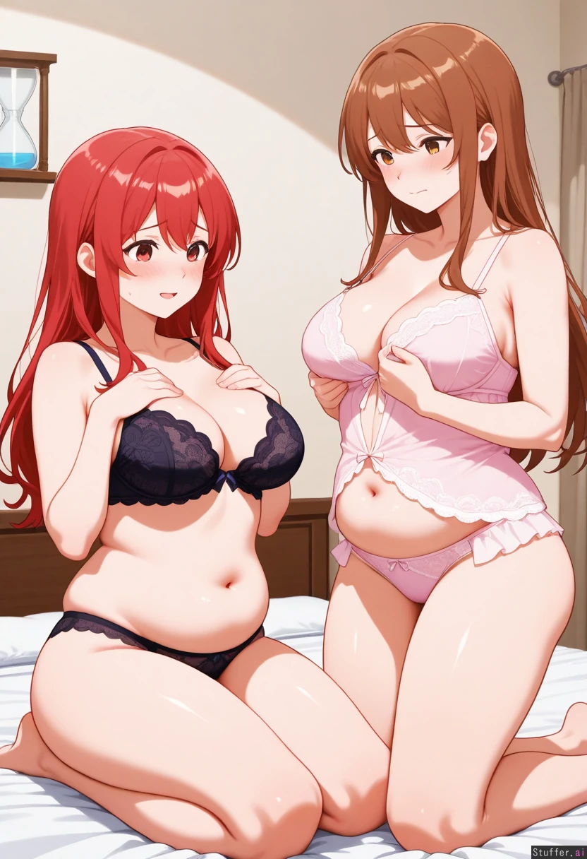 Lesbian_couple, yuri, Aroused, horny, Girl 1: the chubby one, red hair, lingerie, embarrassed with weight gain, ((chubby_belly:0.6)), ((bloated belly:0.4)), kneeling on bed, showing off, hands on breast, Girl 2: less chubby, brown_hair, hourglass, happy with girlfriend_ weight_gain,
