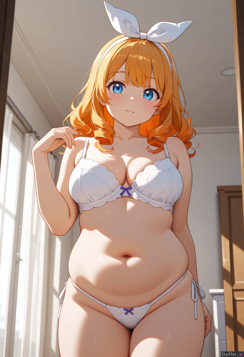 Digital manga illustration, high-fidelity color grading. Art style is a blend of soft cel shading and painterly highlights. The color palette is dominated by warm amber and soft cream tones, with high-contrast pops of vibrant bubblegum pink and yellow. Characters have a subtle rim light and a soft bloom effect that makes the edges appear to glow. Shadows are not black but use warm purple and deep orange gradients to create a soft, "squishy" aesthetic. The lighting is volumetric and airy, simulating a bright, sunlit indoor room with soft-focus reflections on smooth surfaces. blonde_hair , blue eyes , curly hairs , (medium_breasts 1.4) , white hairband , wearing white bra, wearing black micro panties in changing room , (Flat color), (chubby belly:1.3)
