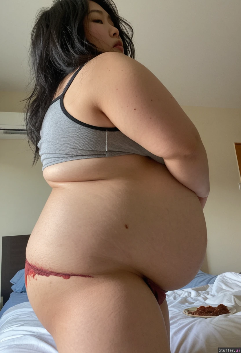 35yo Korean woman with long black messy m hair, no makeup, wearing grey spighetti strap tank top and grey panties in a bedroom standing (Looking at belly) (Front of body in view) (Side view:1) (morbidly Obese:1) Overstuffed (Sauce on chest and belly:1.3) (Thick arms) (Love handles spilling over panties:1.2) (Hands on belly) Strained expression