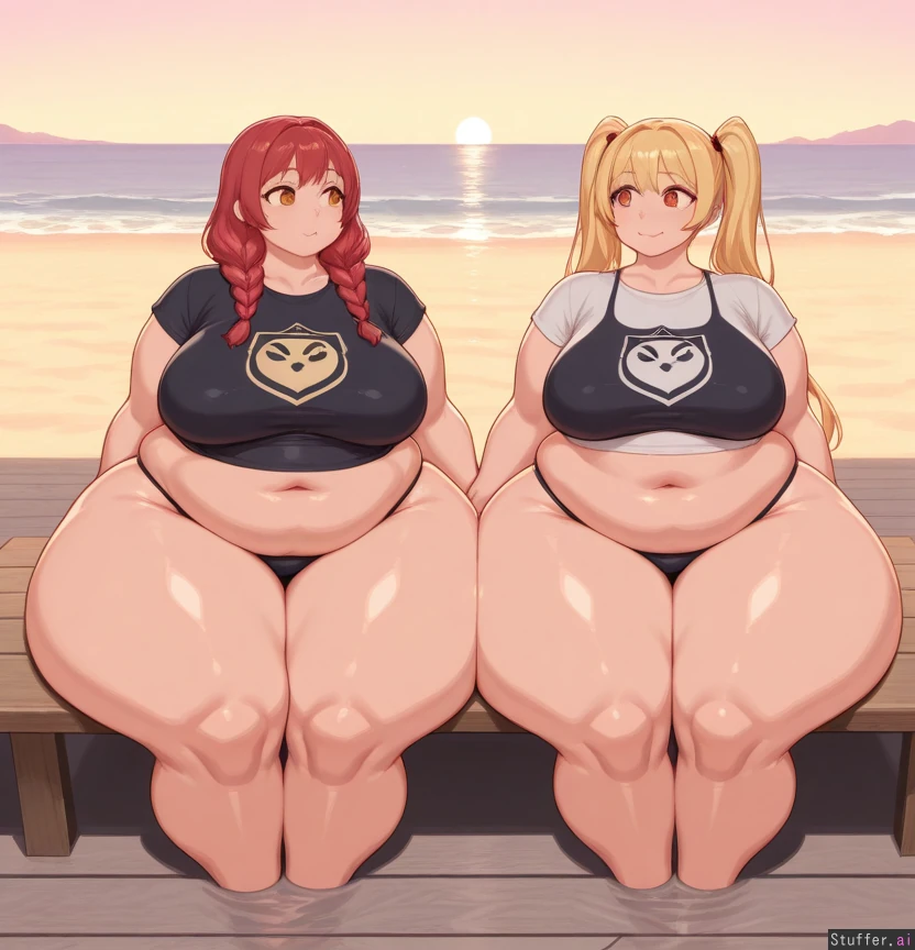 highly detailed,detailed eyes, 2 girls, ((each girl different design)), Pastel colors, flat colors,sea,beach,((mature)), Girl 1: long blond hair, braids towards back, amber eyes, (medium breasts: 0.5), hips and thighs much fatter than upper body, (fat thighs: 1.6), (massive hips: 1.6), fat legs, black t-shirt, black bikini bottom, happy, sitting Girl 2: red hair, ponytails on side, left eye amber, right eye red, (medium breasts: 0.5), hips and thighs much fatter than upper body, (fat thighs: 1.4), (massive hips: 1.4), fat legs, black bikini , exited, eating looking at each other, holding hands, getting fatter
