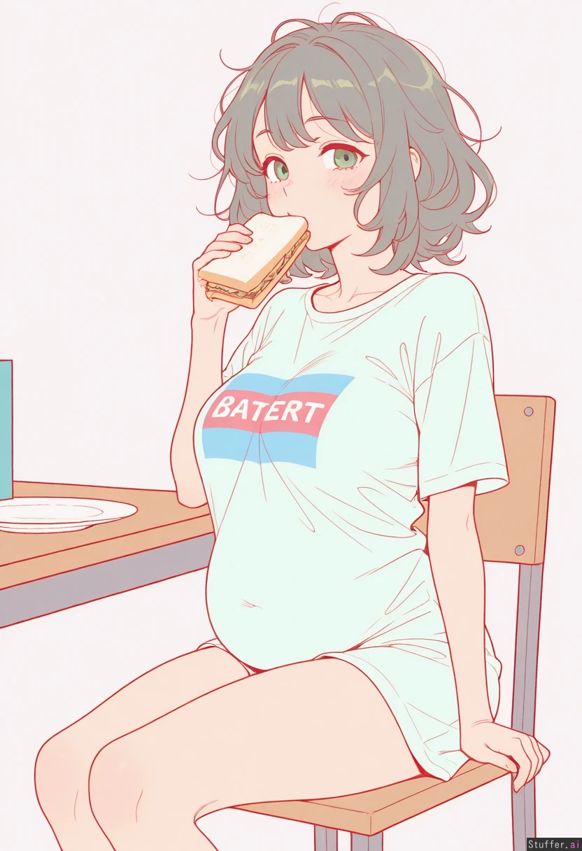 highly detailed,detailed eyes, solo, Pastel colors, flat colors,((mature)), from waist up, no legs visible in the shot Long ginger messy hair Green eyes ((Big breast: 1)) ((Soft belly: 1)) Sitting on chair next to a table Eating sandwich Excited Skinny Colourful t shirt Viewer from side