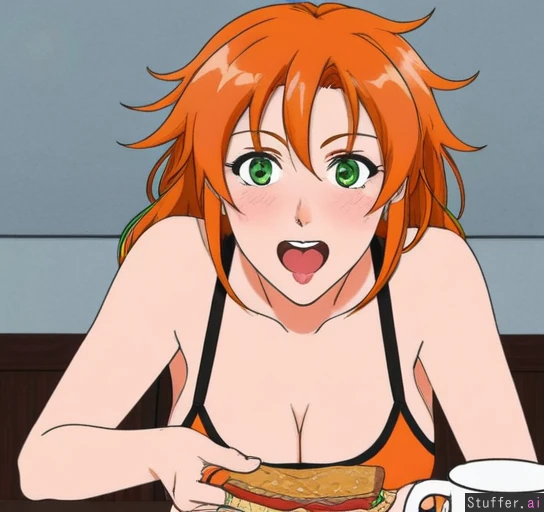 Behind table, visible only from waist up, long orange messy hair, green eyes (anime style), (mature) ((Big breast: 0)) ((Soft belly: 0)) Eating sandwich Excited
