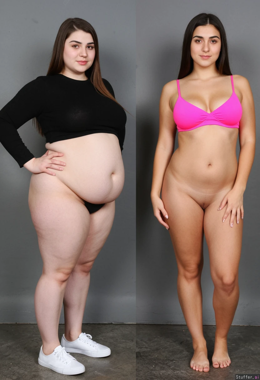 2girls, Armenian college girl, early 20s years old, Make the left girl super short gaining weight, make the girl on the right hyper tall and fit,