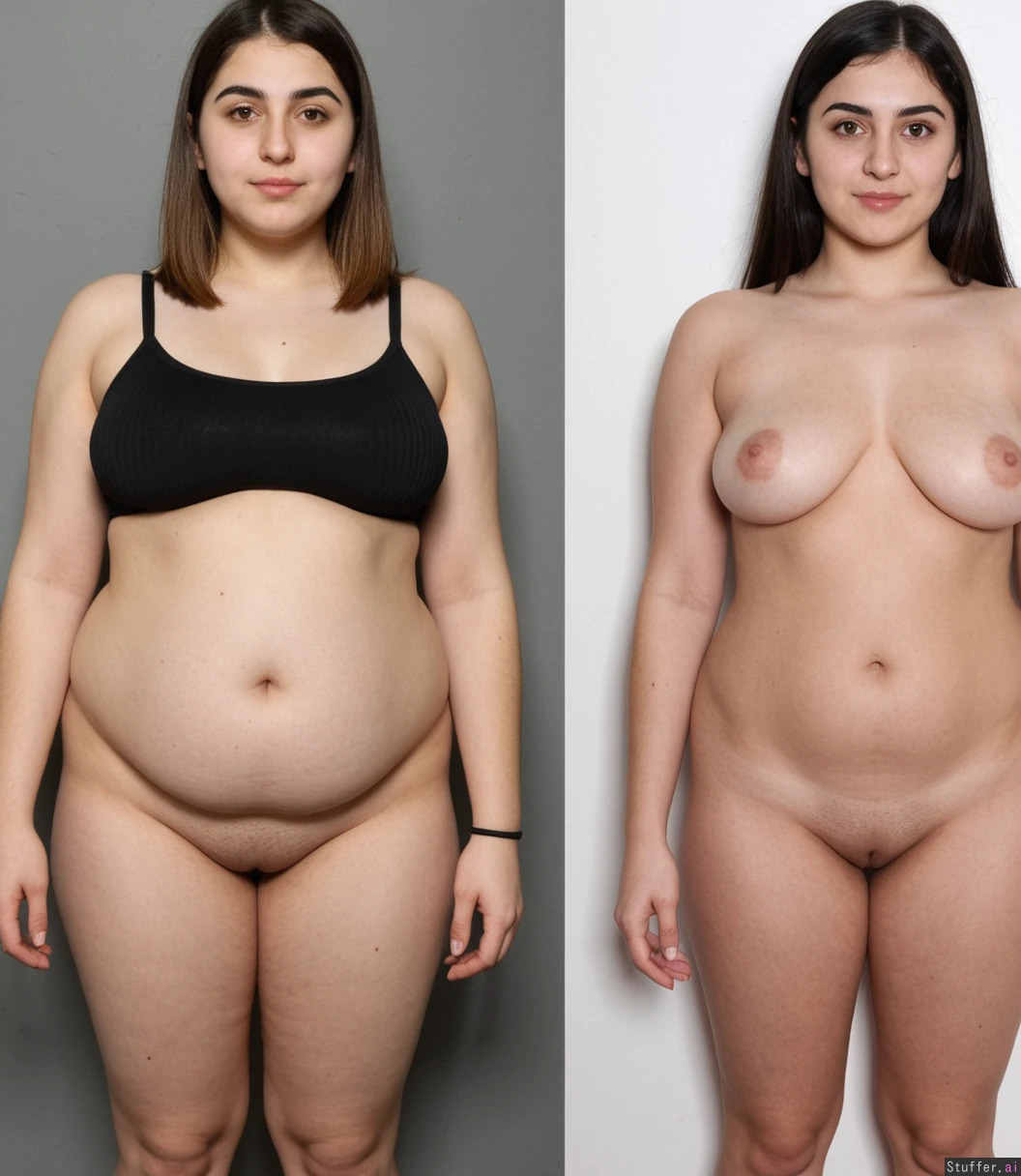 2girls, Armenian college girl, early 20s years old, Make the left girl super short gaining weight, make the girl on the right hyper tall and fit, Big belly, belly_expansion