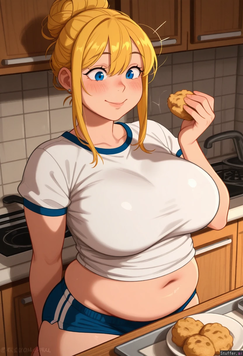 highly detailed, best quality, perfect anatomy, perfect proportions, perfect lighting, warm lighting, perfect shading, beautiful face, beautiful eyes, Solo, (Krekkov (artist), KAMII MOMORU (artist), khyle (artist)) ((Yor Briar)) Blonde hair, blue eyes, messy bun Kitchen, standing behind table, looking at muffins, excited Gym clothing, skindentation, motion lines blushing (large breasts: 1), (chubby: 1.2) (Muffin top: 1.2) (Soft belly: 1) Getting fatter Eating,