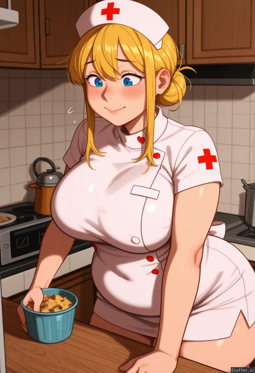 highly detailed, best quality, perfect anatomy, perfect proportions, perfect lighting, warm lighting, perfect shading, beautiful face, beautiful eyes, Solo, (Krekkov (artist), KAMII MOMORU (artist), khyle (artist)) ((Yor Briar)) Blonde hair, blue eyes, messy bun Kitchen, standing behind table, looking at muffins, excited Nurse uniform, skindentation, motion lines blushing (large breasts: 0.5), (chubby: 1.2) (Muffin top: 1.2) (Soft belly: 1) Getting fatter Eating,