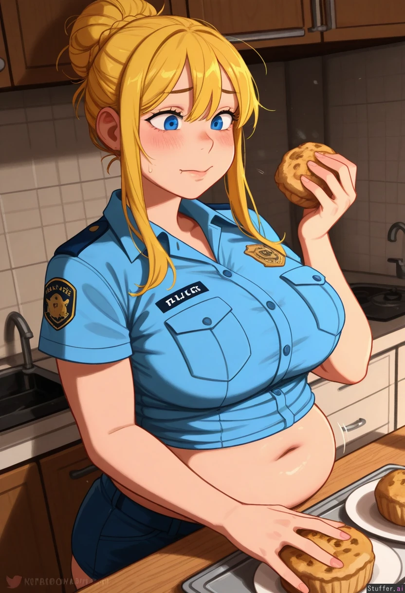 highly detailed, best quality, perfect anatomy, perfect proportions, perfect lighting, warm lighting, perfect shading, beautiful face, beautiful eyes, Solo, (Krekkov (artist), KAMII MOMORU (artist), khyle (artist)) ((Yor Briar)) Blonde hair, blue eyes, messy bun Kitchen, standing behind table, looking at muffins, Police uniform, skindentation, motion lines blushing, upset (large breasts: 0.5), (chubby: 1.2) (Muffin top: 1.2) (Soft belly: 1) Getting fatter Eating,