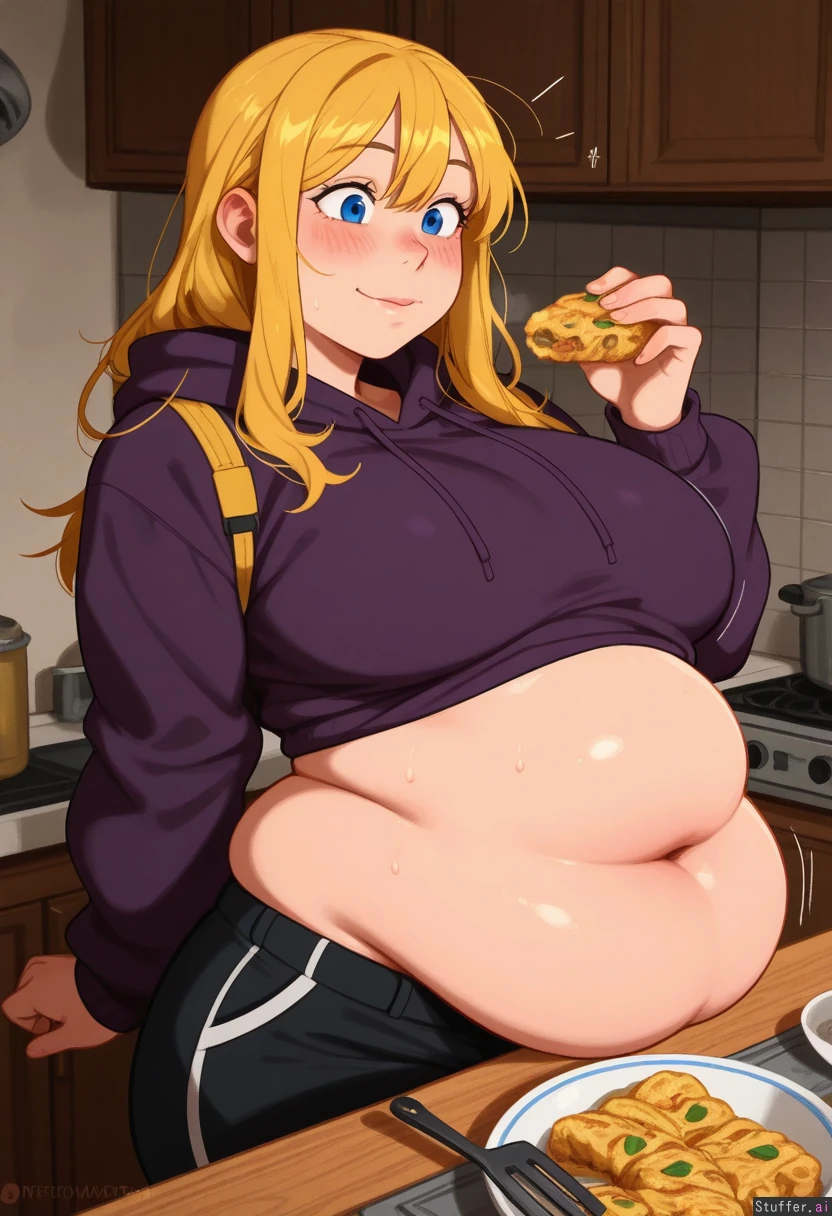 highly detailed, best quality, perfect anatomy, perfect proportions, perfect lighting, warm lighting, perfect shading, beautiful face, beautiful eyes, Solo, (Krekkov (artist), KAMII MOMORU (artist), khyle (artist)) ((Yor Briar)) Blonde hair, blue eyes, messy long Kitchen, standing behind table, looking at mpizza, Hoodie, skindentation, motion lines blushing, excited (large breasts: 0.8), (chubby: 1.4) (Muffin top: 1.4) (Soft belly: 1.4) (Side handles: 1.6) (Belly rolls: 1.6) Getting fatter Eating, rubbing belly