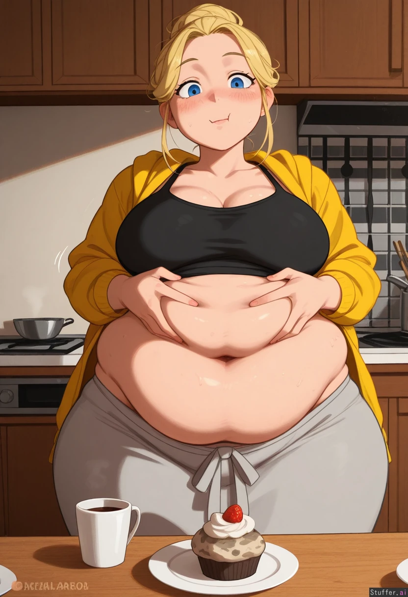 highly detailed, best quality, perfect anatomy, perfect proportions, perfect lighting, warm lighting, perfect shading, beautiful face, beautiful eyes, Solo, (Krekkov (artist), KAMII MOMORU (artist), khyle (artist)) ((Yor Briar)) Blonde hair, cute hairstyle Blue eyes Kitchen, standing behind table, coffee and cake Black tank top, yellow jacket, long skirt, skindentation, motion lines blushing, excited (large breasts: 0.8), (Fat: 1.8) (Muffin top: 1.8) (Soft belly: 1.8) (Side handles: 1.8) (Belly rolls: 1.8) (Fat hips: 1.8) Getting fatter, eating cake Belly resting on table