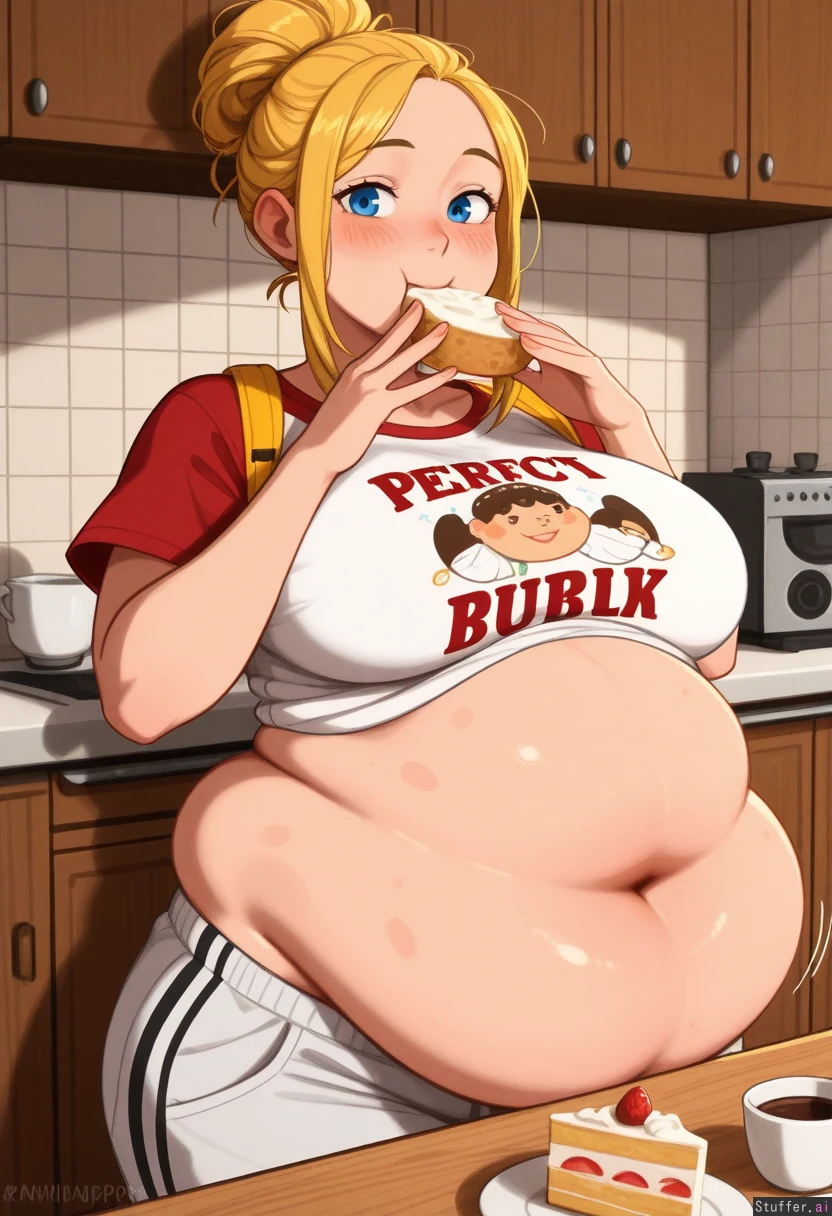 highly detailed, best quality, perfect anatomy, perfect proportions, perfect lighting, warm lighting, perfect shading, beautiful face, beautiful eyes, Solo, (Krekkov (artist), KAMII MOMORU (artist), khyle (artist)) ((Yor Briar)) Blonde hair, cute hairstyle Blue eyes Kitchen, standing behind table, coffee and cake Tshirt, white sweatpants, skindentation, motion lines blushing, embarrassed (large breasts: 0.8), (Fat: 1.8) (Muffin top: 1.8) (Soft belly: 1.8) (Side handles: 1.8) (Belly rolls: 1.8) (Fat hips: 1.8) Getting fatter, eating cake Belly resting on table