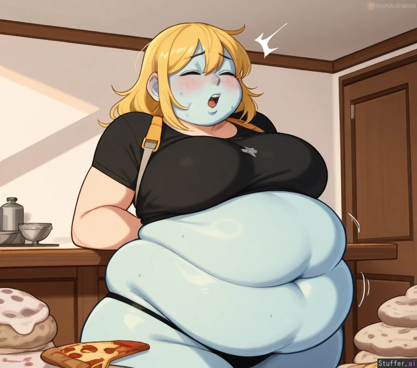 highly detailed, best quality, perfect anatomy, perfect proportions, perfect lighting, warm lighting, perfect shading, beautiful face, beautiful eyes, Solo, (Krekkov (artist), KAMII MOMORU (artist), khyle (artist)) ((Yor Briar)) Blonde messy hair Clossed eyes Kitchen, standing behind table, pizza and wine Black tshirt, black panties, skindentation, motion lines blushing, mouth open, head back (large breasts: 1.2), (Fat: 2) (Muffin top: 2) (Soft belly: 2) (Side handles: 2) (Belly rolls: 2) (Fat hips: 2) Getting fatter, rubbing belly Belly resting on table