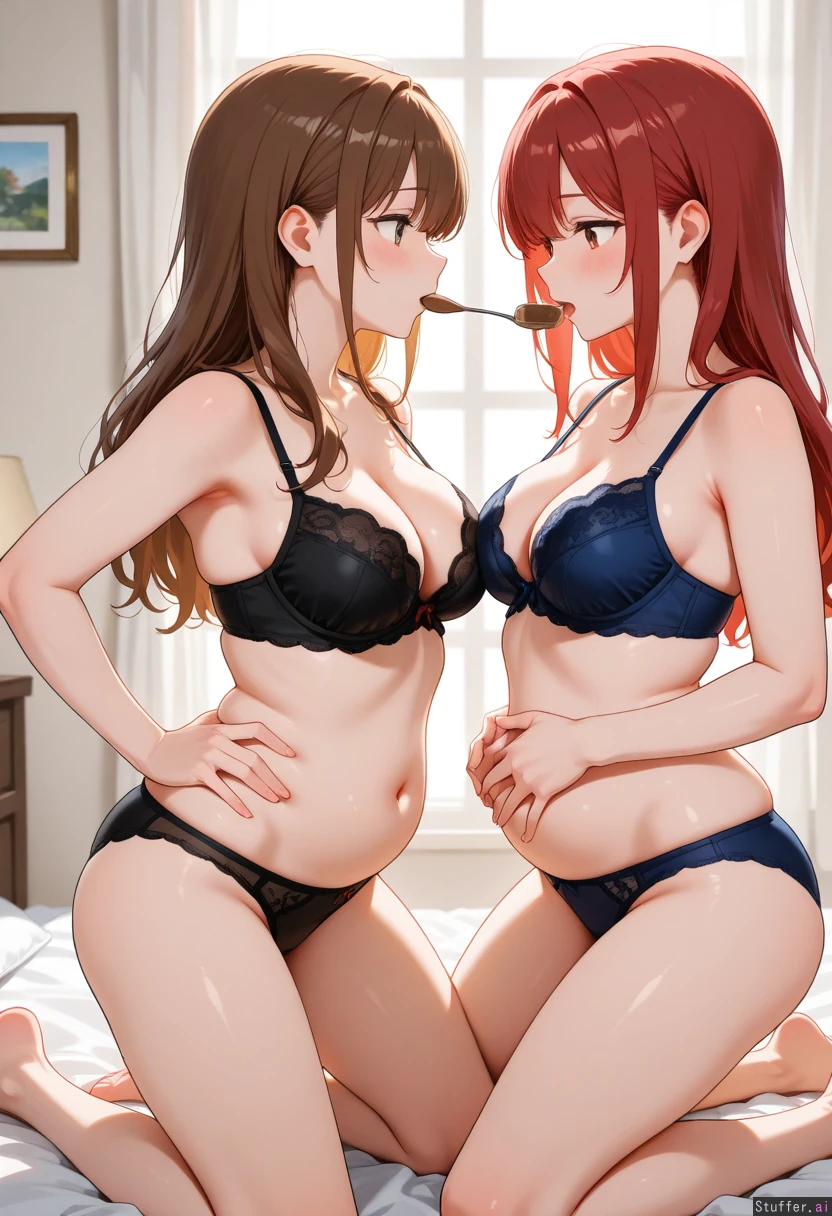 Lesbian_couple, yuri, tall_couple Aroused, horny, Girl 1: the busty one, red hair, lingerie, horny, fit, kneeling on bed, showing off, hands on hips, thin_thighs, dominant, feeding girlfriend Girl 2:brown_hair, happy with girlfriend, pawg, submissive, starting weight gain, slightly_pudgy belly ,