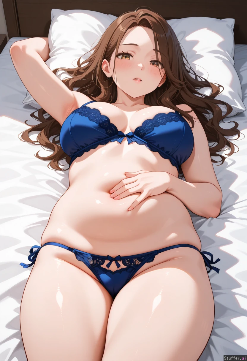 Solo girl, blue lingerie too tight, one hand on belly, laying on bed, Girl:brown_hair, pawg, submissive, medium_breasts:0.01, chubby_body, stretch_marks,