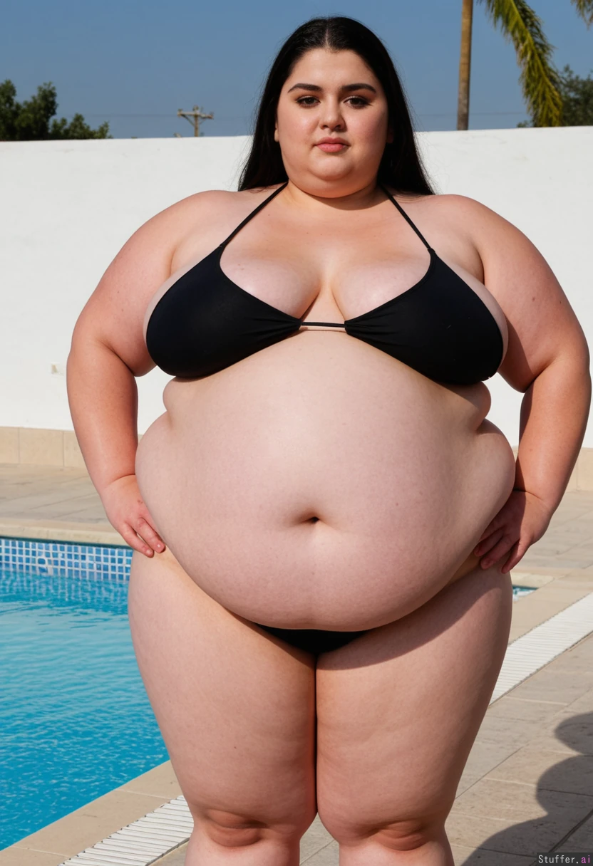 Italian women 28 years old Olive skin Long black hair (Chubby cheeks) Very beautiful (Extremely cute face) Big nose (Big beautiful brown eyes) Big eyelashes Big lips (Big boobs) ((Round face)) Double chin (Chubby lower belly) ((Amazing cleavage)) (Black string bikini) Bare foot Standing next to a pool (Full body view standing) (Slightly pudgy body) Bloated belly Very skinny ((Extreme weight gain: 1.8))