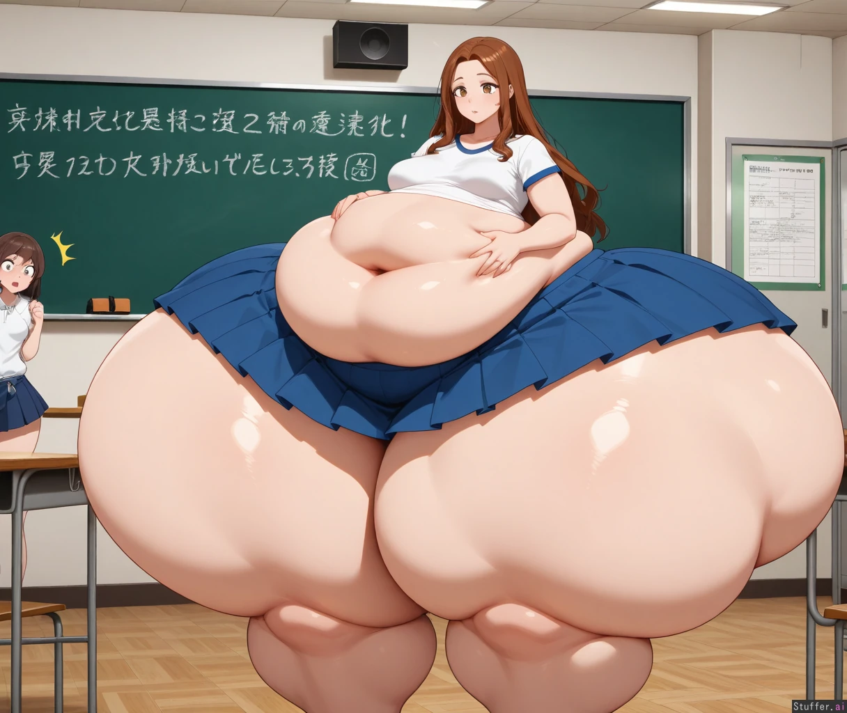 cute girl, brunette, long hair, mature, classroom, surprised expression, ((smallbreasts, huge hips, gigantic waist, fat thighs:1.5)), ((hyper wide thighs:1.5)), ((blue skirt, chubby belly peeking out under skirt)), ((hyper wide hips:1.5)), ((hands on belly)),