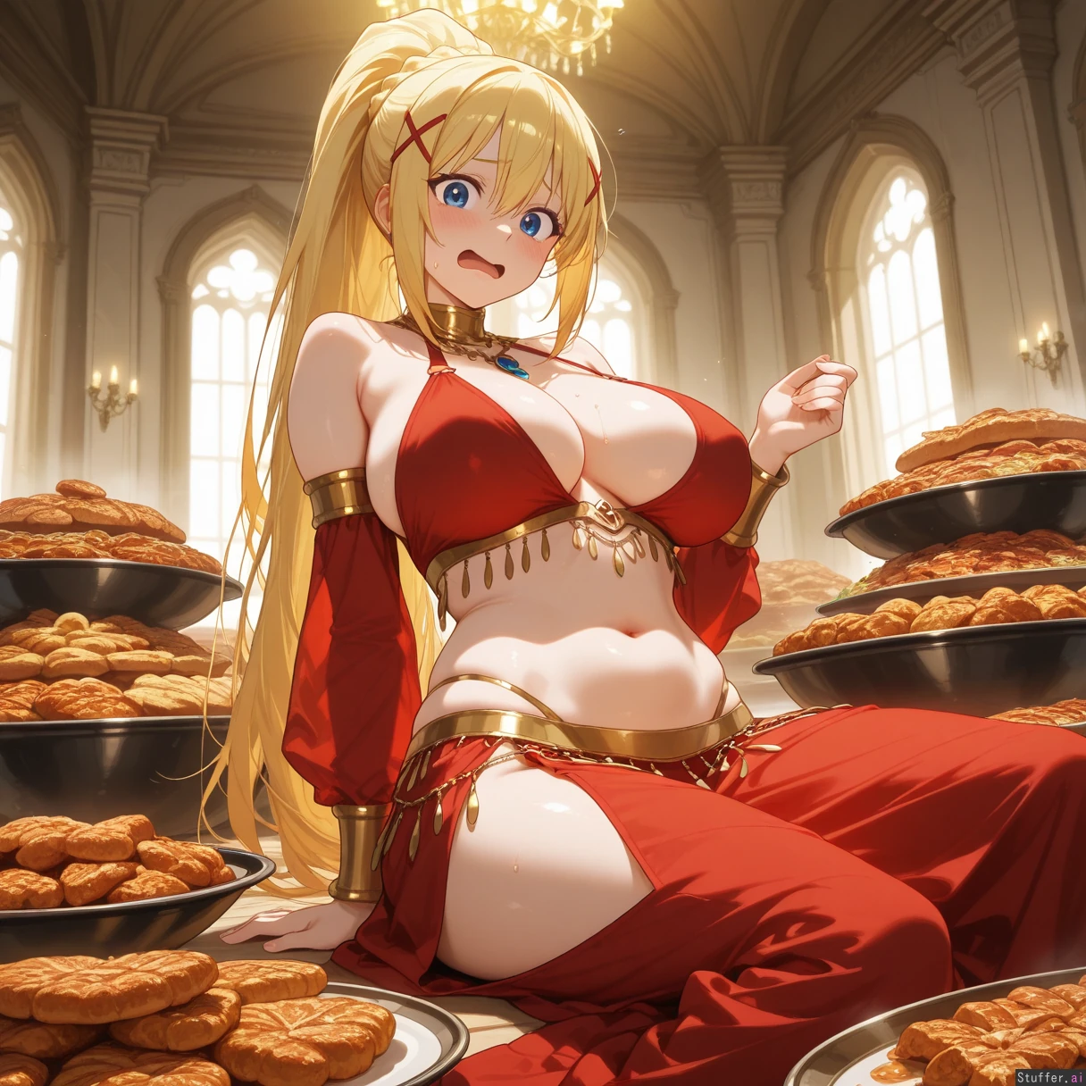 Darkness_(Konosuba), red belly_dancer dress, lavish palace, nervous, scared, shocked as she is being told she needs to fatten up for the king, looking at viewer, sitting down in front of a massive feast of food including meats cheeses rice pork and pastries, amazing quality, high resolution, detail background
