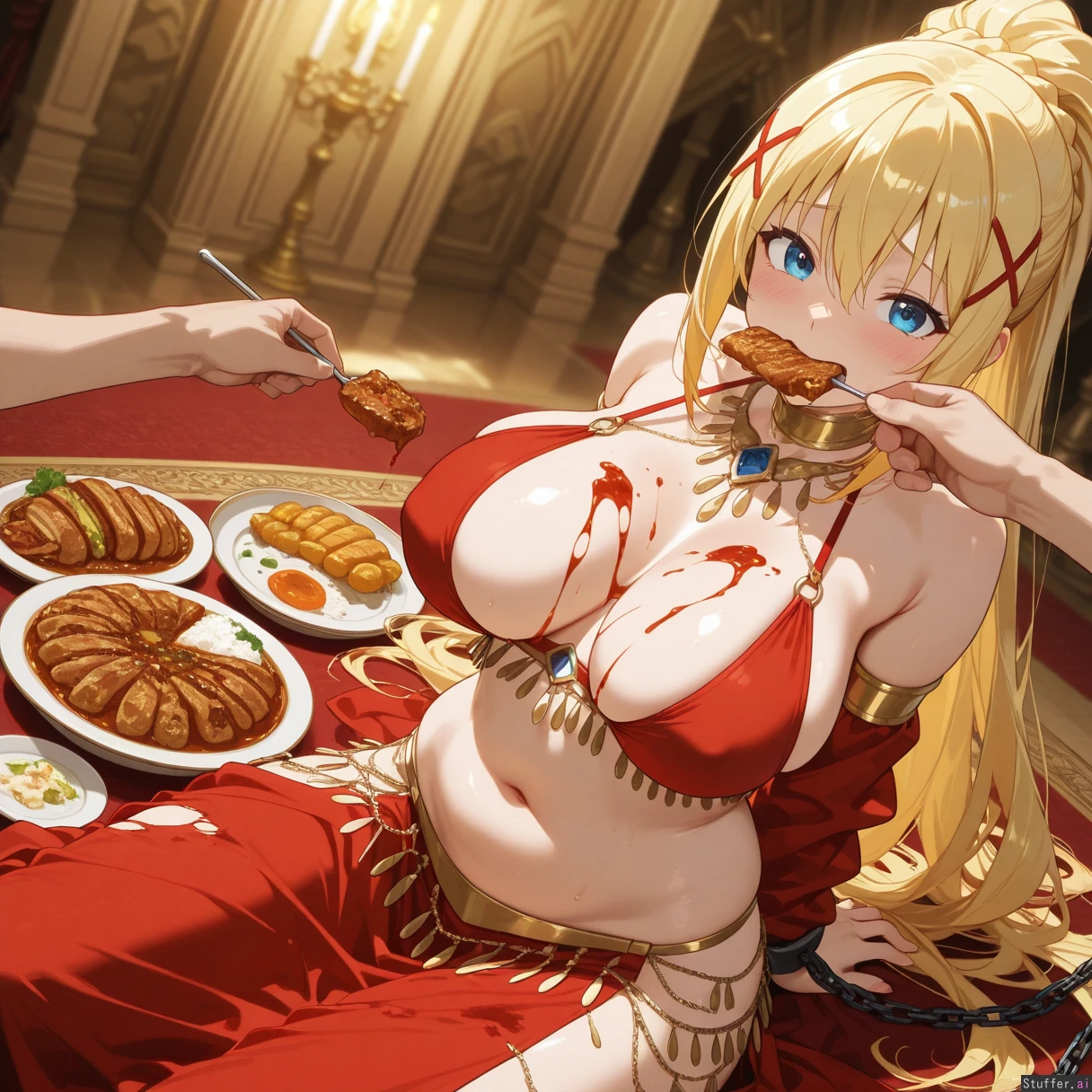 Darkness_(Konosuba), red belly_dancer dress, lavish palace, nervous, scared, eating all of the food of the feast because she was instructed to fatten up for the king, looking at viewer, hands chained behind back, ((royal palace servants handfeeding her food into her mouth to fatten her up)), (they just keep feeding her and feeding her!), her belly is being pushed to its limit!, food scraps on her body, food oils, sitting down in front of a massive feast of food including meats cheeses rice pork and pastries, amazing quality, high resolution, detail background
