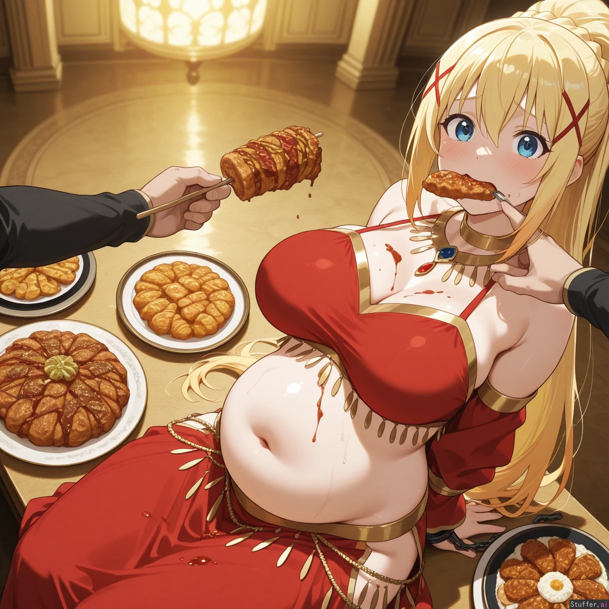 Darkness_(Konosuba), red belly_dancer dress, lavish palace, nervous, scared, eating all of the food of the feast because she was instructed to fatten up for the king, looking at viewer, hands chained behind back, ((royal palace servants handfeeding her food into her mouth to fatten her up)), (they just keep feeding her and feeding her until she explodes!), (((her belly is being pushed to its limit!))), taut bloated belly, food scraps on her body, food oils, sitting down in front of a massive feast of food including meats cheeses rice pork and pastries, amazing quality, high resolution, detail background