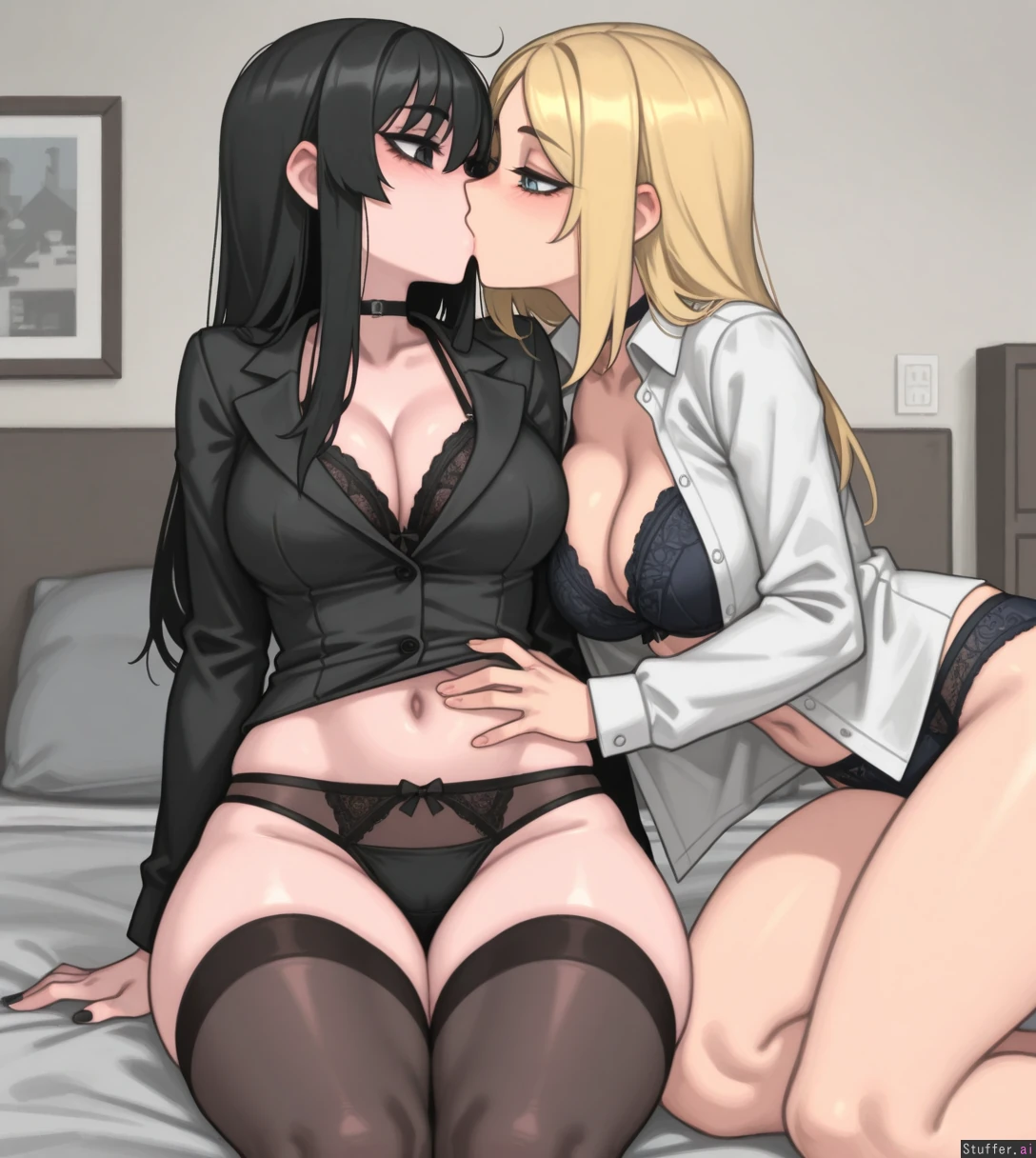 Elpacha2(artist), (kelvin_hiu\(artist\)), kipteitei(artist), 2girls, apartment, adult, adult, tall, black_hair, blonde, black_eyes, blue_eyes, straight_hair, forehad_visible, bangs, pajama, bra, panties, lingerie, goth, emo, office_lady, skidentation, slight navel peek, blush, slender, lesbian_couple, yuri, kissing, laying