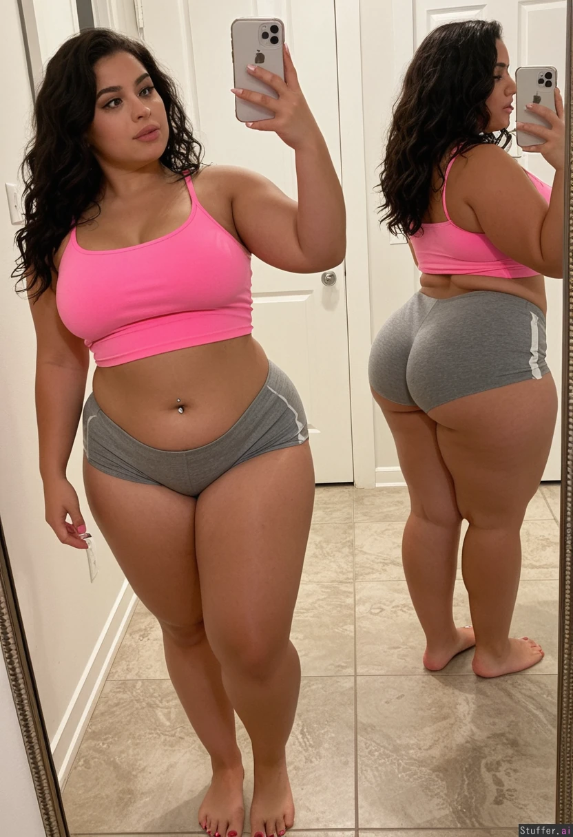 A short statured gorgeous (beautiful popular girl model face) Latina woman with dark wavy hair wearing a pink crop top with grey spandex shorts barefoot toes painted white, Standing taking a mirror selfie. She is a shortstack , pear-shaped_figure , (wide hips) (thick thighs) (bellybutton piercing) (obese) (bottom heavy) Real life, realistic , best_quality