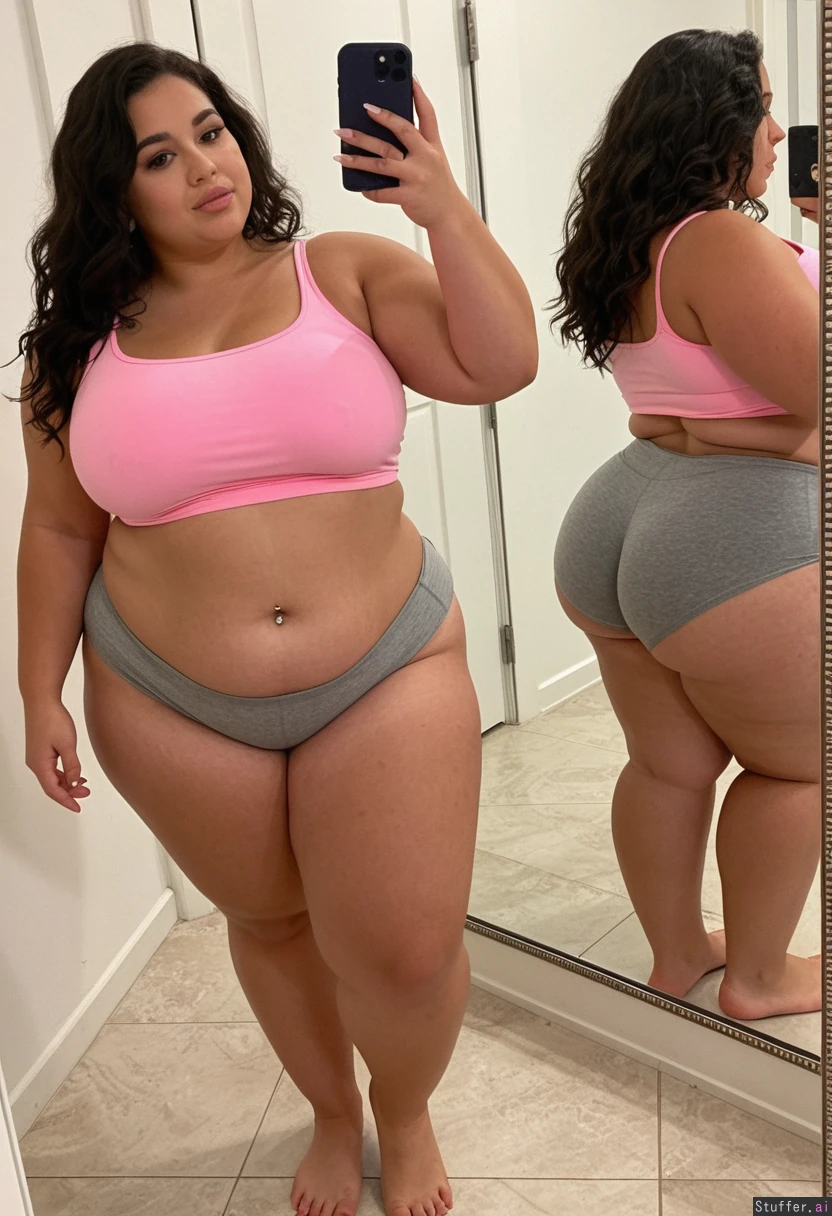 A short statured gorgeous (beautiful popular girl model face) Latina woman with dark wavy hair wearing a pink crop top with grey spandex shorts barefoot toes painted white, Standing taking a mirror selfie. She is a shortstack , pear-shaped_figure , (wide hips) (thick thighs) (bellybutton piercing) (extremely obese) (bottom heavy) (BBW) Real life, realistic , best_quality