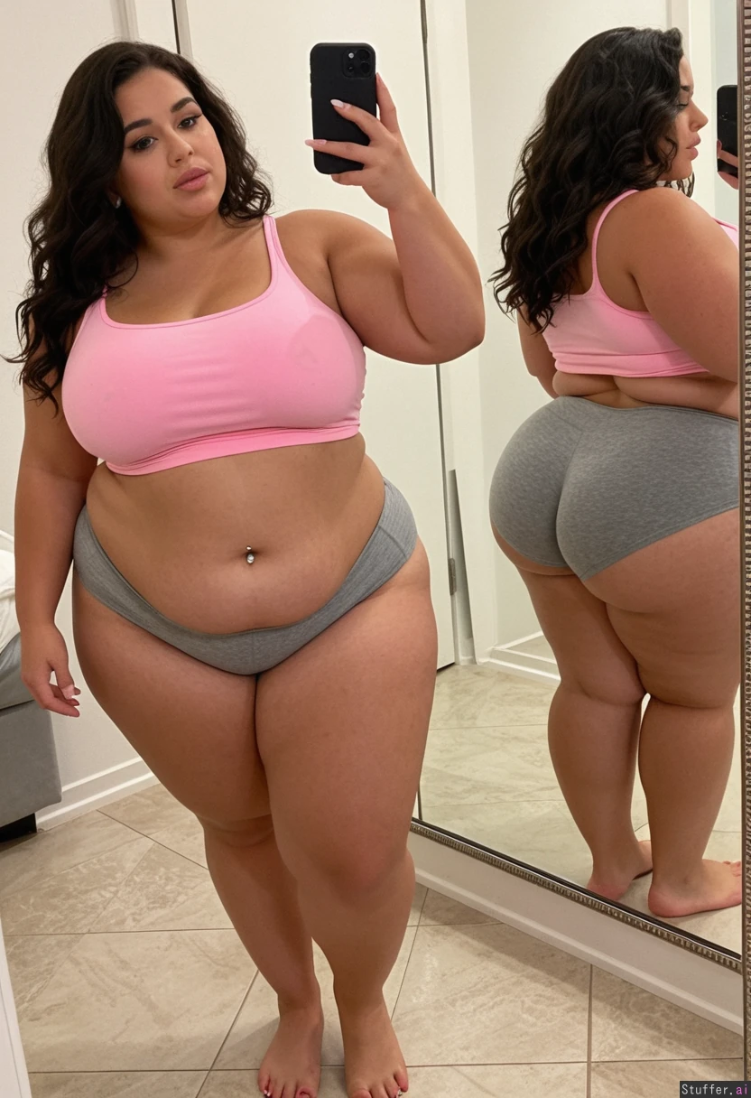 A short statured gorgeous (beautiful popular girl model face) Latina woman with dark wavy hair wearing a pink crop top with grey spandex shorts barefoot toes painted white, Standing taking a mirror selfie. She is a shortstack , pear-shaped_figure , (wide hips) (thick thighs) (bellybutton piercing) (extremely hyper obese) (bottom heavy) (SSBBW) Real life, realistic , best_quality