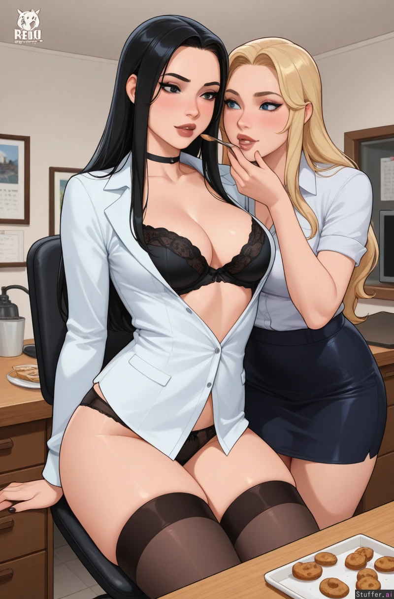 ((High quality Illustration, solo, 1 woman)), (perfect proportions, perfect anatomy), solo girl, (pewbutt(artist):1.5), (KAMII MOMORU( artist):1.1), (kittew(artist):1.0), (reiq(artist)), (detailed fingers), (detailed eyes), (detailed lips), 2girls, apartment, adult, adult, tall, black_hair, blonde, black_eyes, blue_eyes, straight_hair, forehad_visible, bangs, pajama, bra, panties, lingerie, goth, emo, office_lady, skidentation, slight navel peek, blush, slender, lesbian_couple, yuri, standing, sitting on chair, feeder, feedee, feeding, worship