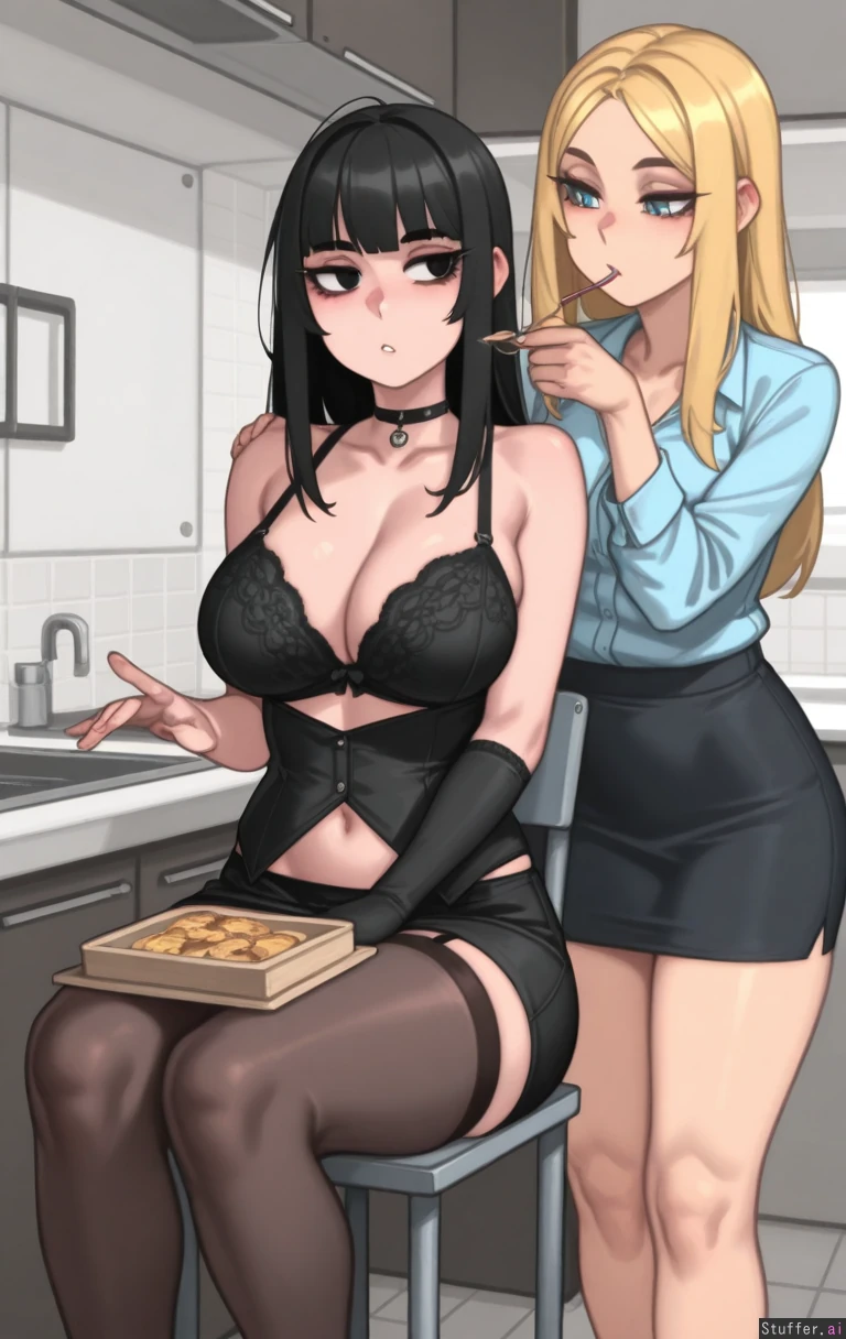 Elpacha2(artist), (kelvin_hiu\(artist\)), kipteitei(artist), 2girls, kitchen, adult, adult, tall, black_hair, blonde, black_eyes, blue_eyes, straight_hair, forehad_visible, bangs, pajama, bra, panties, lingerie, goth, emo, office_lady, skidentation, slight navel peek, blush, slender, lesbian_couple, yuri, standing, sitting on chair, feeder, feedee, feeding, worship