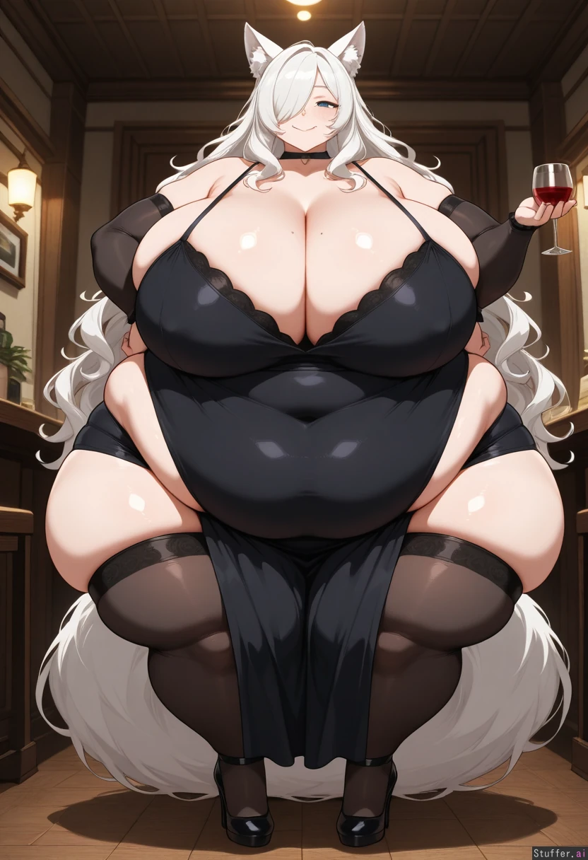 (best quality, high rating, UHD, HDR, 8k resolution, ultra high res, definition lines), (masterpiece), (perfect extreme_extreme_extreme_extreme_extreme_morbidly_obese_immobile_giganticanatomy:1.5))))), ((((Extreme_morbidly_obese_immobile_girl_overfullest_into_her_own_extreme_immobile_soft_size, extreme_chubby_face, soft_cheeks, big_chins:1.5))))))), (Pixiveo\(artist\)), (Flat colors, Wonderful coloring, Wonderful linework, highlight, soft lighting, soft shadow), ((((((([From close_view]:2.4))))))), (((((((on_front:2))))))), tasting glass of wine, overspread_out_her_round_divoted_fat_flabby_arms, (((((((at restaurant:1.2))))))), at night, ((((((Extreme_enormous_overwiden_up_immobile_beauty, extreme_chubby, extreme_thick, extreme_immobile:1.5)))))), ((((extreme_huge_overwiden_out_hips:1.5)))), (huge waistline, large waist, massive voluptuous legs), (extreme_fat_colossal_flabby_thighs:1.5), (extreme fat calves), (extreme_fat_rear), extreme extreme overmassive ankles, ((extreme_fat_bottomheavy)), ((((extreme_big_soft_flabby_stout_arms:1.5)))), flat_belly, (enormous_flabby_back), (round flabby shoulders), (extremely massive stout shoulder_back),(outspread_strong_round_wide_large_shoulders:1.5), vestigial flabby arms, big plump breasts, Cyann : solo, (([white_half-wolf_girl]:1.2)), (([white_wolf_ears, white_wolf_tail])), (tall), ((soft_white_skin)), (gorgeous_cute_voluptuous_fat_wide_face:1.5), (smooth_curvy_plump_crimson_lips, chubby_huge_long_crimson_lips, round_full_fat_chin, soft_wide_full_fat_cheeks, full_fat_long_jawline, wide_fat_chubby_neck, cute_nose:1.2), (mole_on_cheekbone, freckles_nose:1.2), (down-turned long mature cyan blue eyes:1.3), (Sandersonia white hairstyle, extremely massive voluptuous wide long thick white wavy hair, white long hair over one eye:1.3), white eyebrows, ((((((([Fully_in_Gigantic_black_fancy_cocktail_black_dress, fully in fat black dress]:1.5))))))), black sleeves, ((((((extreme great stockings)))))), [fat divoted black heels], (Horny gaze, seductive expression, heavy breathing), great happy seductive shy smile, extreme morbidly obese pretty chubby face, big chin, divoted obese neck, curvy lips, blushing, extreme obese shoulders, ((((((From close_view:2))))))