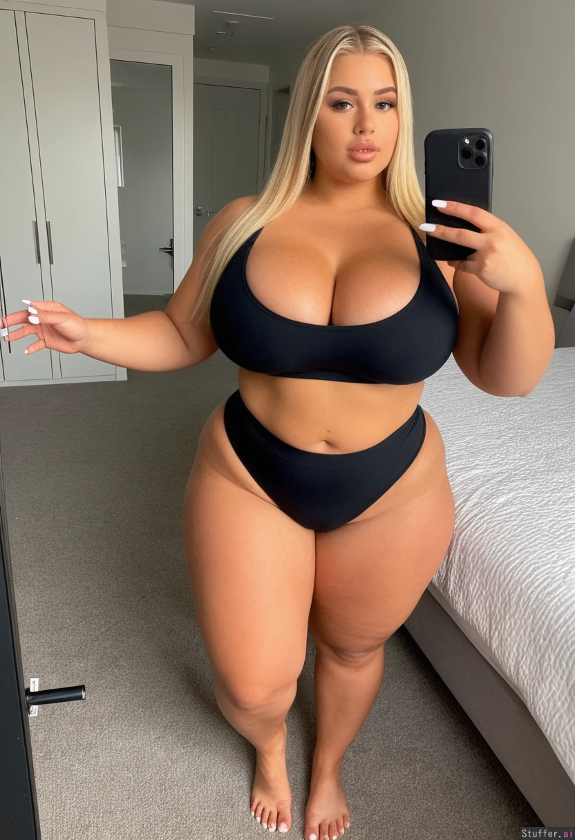 1 white American, Caucasian tan skin, bright light long blonde hair, elegant hair, 20 years old, gorgeous face, (perfect natural breasts:1.6), looking at viewer, detailed eyes, defined jawline, beautiful influencer, ((thick thighs:1.8)) ((Big belly:1.5)) ((perfect curve fitting black workout set, fully clothed:1.8)) ((Huge pushed up cleavage:1.8)) (Enormous ultra wide overflowing hips:1.9), (Thick plump butt:1.2), ((taking sexy mirror bedroom selfie):1.9), (view from above:1.8), ((fat gigantic soft flabby chubby arms:1.9)) , ((white toenails:1.7)), ((hyper realism))