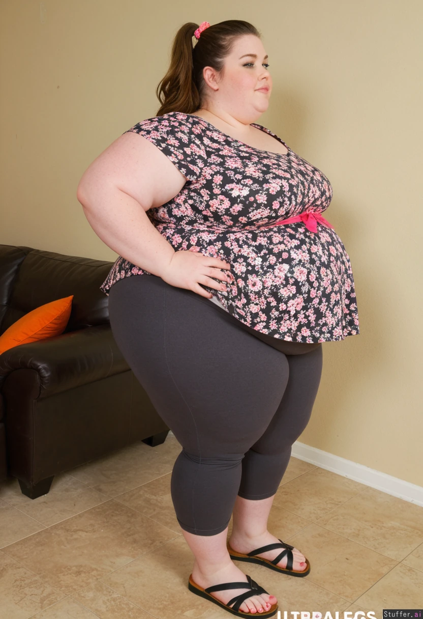 25 year old beautiful ultr morbidly obese fat ssbbw Charcoal capri leggings, oversized pink floral peplum blouse, sandles, brown hair, brown eyes, bow in hair, hair in ponytail Park engagement party Fully clothed Fully covered Side view Fat belly sticks out far in front Ultra round fat bloated belly Gained weight recently Bloated gut Face getting fatter Ultra massive fat legs Hyper massive fat arms