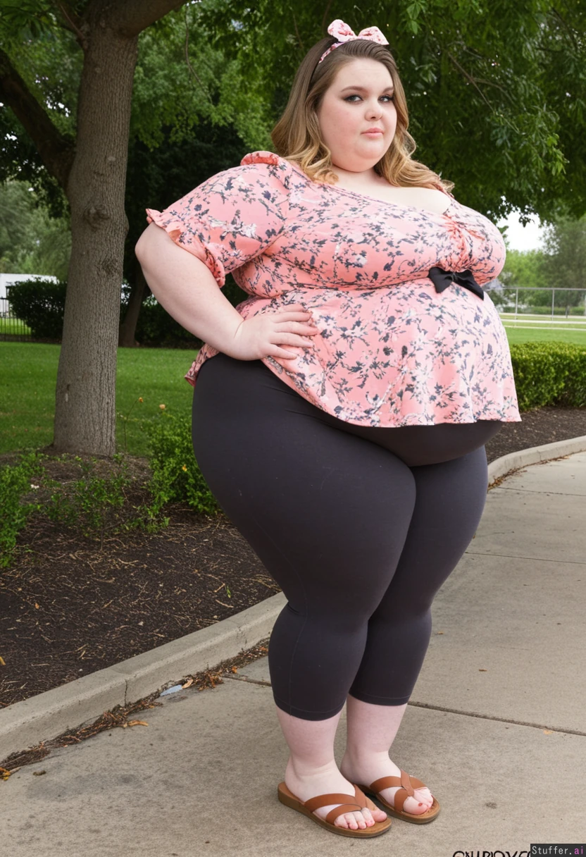 25 year old beautiful obese fat girl Charcoal capri leggings, oversized pink floral peplum blouse, sandles, dark blonde hair, brown eyes, bow in hair Park engagement party Fully clothed Fully covered Side view Fat belly poking out far in front Bloated gut Hyper massive fat legs Ultra wide massive fat hips Chubby cheeks Gained weight recently