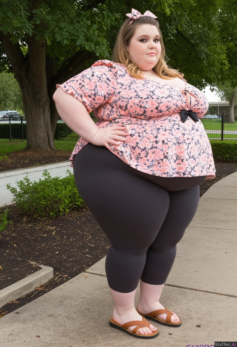 25 year old beautiful Ultra obese fat girl Charcoal capri leggings, oversized pink floral peplum blouse, sandles, dark blonde hair, brown eyes, bow in hair Park engagement party Fully clothed Fully covered Side view Fat belly poking out far in front Bloated gut Hyper massive fat legs Ultra wide massive fat hips Chubby cheeks Gained weight recently