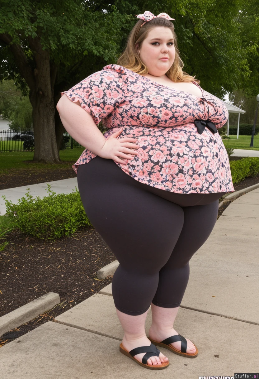 25 year old beautiful Ultra obese fat girl Charcoal capri leggings, oversized pink floral peplum blouse, sandles, dark blonde hair, brown eyes, bow in hair Park engagement party Fully clothed Fully covered Side view Hyper very fat belly poking heaps out far in front Bloated gut Hyper massive fat legs Ultra wide massive fat hips Chubby cheeks Gained weight recently Ultra wide massive fat thighs