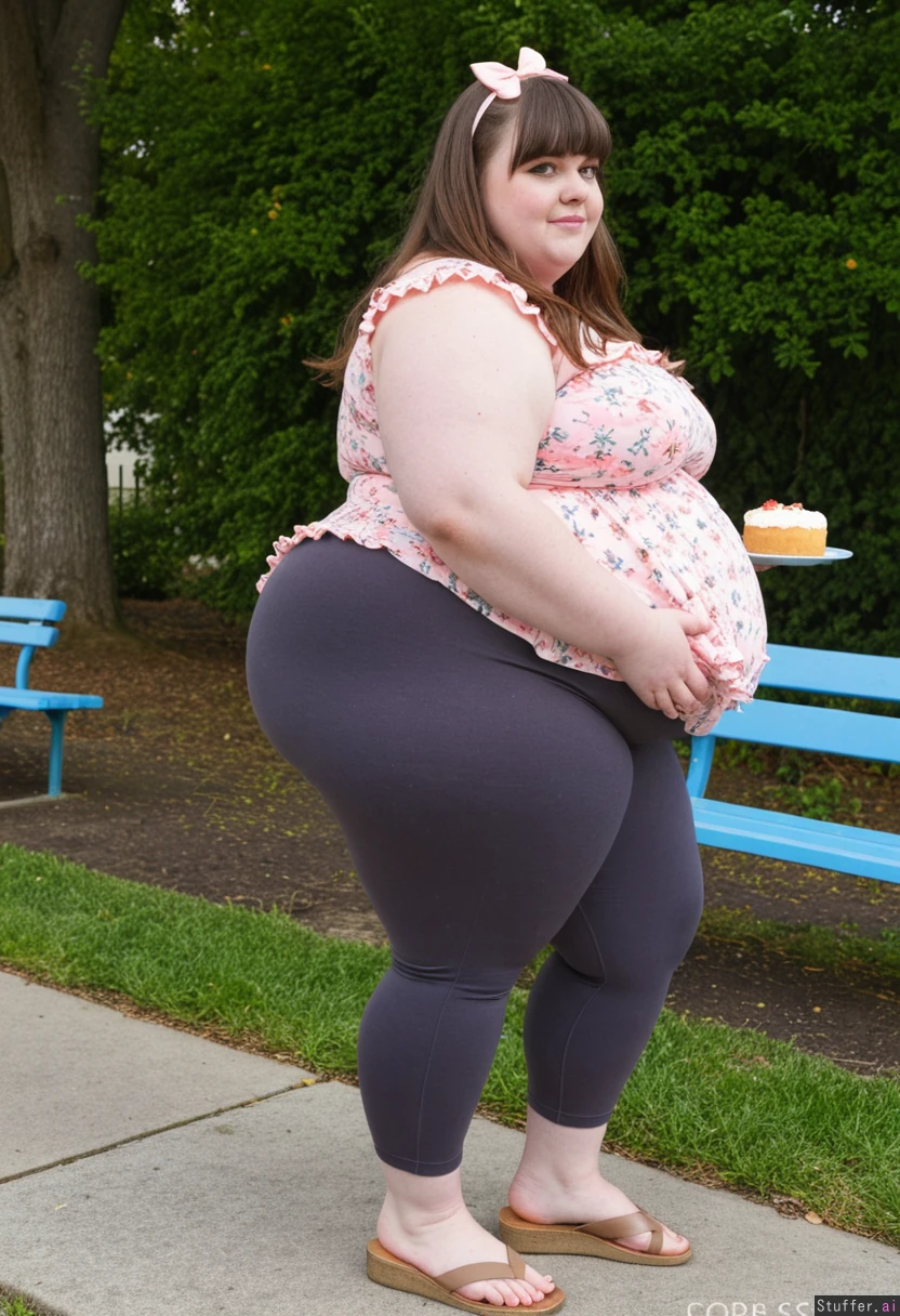 25 year old beautiful obese fat ssbbw Charcoal capri leggings, oversized frilled pink floral peplum maternal blouse, sandles, brown hair, brown eyes, bow in hair, straightened hair, bangs, holding slice of cake View from side Park engagement party Fully clothed Fully covered Side view Fat belly sticks out far in front Ultra round fat bloated belly Gained weight recently Hyper massive fat legs Fat hips Side view