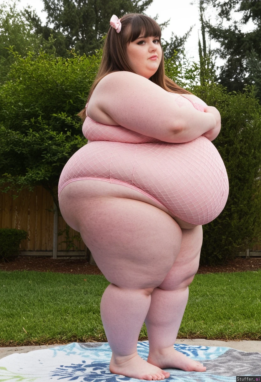 25 year old obese fat ssbbw Pink knickers, oversized beige peplum mesh lingerie, brown hair, brown eyes, bow in hair, straightened hair, bangs, barefeet, arms crossed View from side Backyard Fully clothed Fully covered Fat belly sticks out far in front Ultra round fat bloated belly Gained weight recently Hyper massive fat legs Ultra wide massive fat hips Hyper massive fat thighs Side view