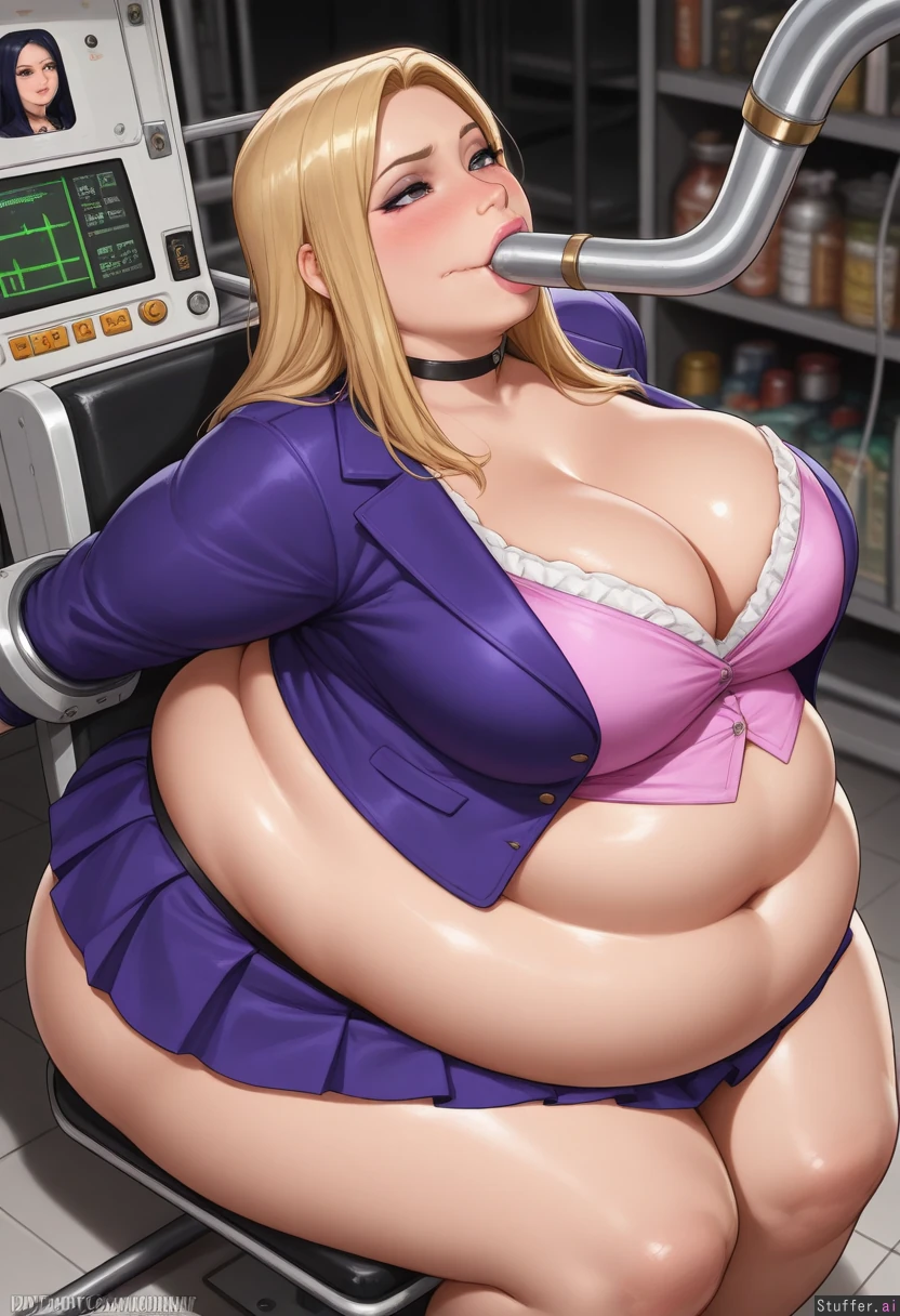 ((High quality Illustration, solo, 1 woman)), ((perfect proportions, perfect anatomy)), solo girl, (pewbutt(artist):1.5), (KAMII MOMORU( artist):1.1), (kittew(artist):1.0), (reiq(artist)), (((1girl, Caitlyn Kiramman, Perfect face, sharp jawline, 21 years old, long straight blonde hair, dark blue brown eyes, pink lips, blush makeup, realistic face, ((realistic eyes)), beautiful legs, straight nose, squinting, looking up, side view))) ((huge breasts: 1.4, cleavage))) ((shelves full of donuts background, lots of donuts, surronded by donuts, dark lighting)), embarrassed, ((restrained in chair, head tilted back)), ((feeding tube in mouth, drinking from tube, giant feeding machine)), ((pink shirt)), ((purple mini skirt, purple business blazer)), ((obese, huge_belly: 1.7))