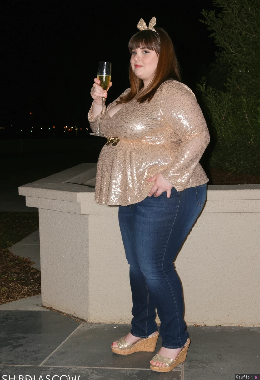 30 year old obese fat ssbbw oversized dark gold sparkled peplum blouse with sequins, jeans, brown hair, brown eyes, bow in hair, straightened hair, bangs, sandles, holding glass of champagne Side view New years eve outside park party Fully clothed Fully covered View from side Fat belly sticks out far in front Side view