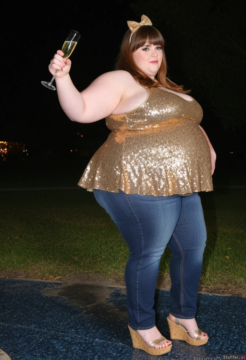 30 year old obese fat ssbbw oversized dark gold sparkled peplum dress with sequins, jeans, brown hair, brown eyes, bow in hair, straightened hair, bangs, sandles, holding glass of champagne Side view New years eve outside park party Fully clothed Fully covered View from side Fat belly sticks out far in front Ultra wide massive fat legs Fat thighs Side view
