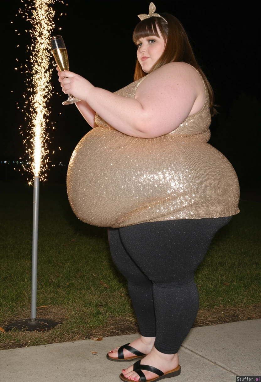 30 year old morbidly obese fat ssbbw oversized dark gold sparkled peplum dress with sequins, charcoal capri leggings, brown hair, brown eyes, bow in hair, straightened hair, bangs, sandles, holding glass of champagne Side view New years eve outside park party Fully clothed Fully covered View from side Ultra massive fat arms Fat bloated belly sticks out far in front Ultra wide massive fat hips Hyper humongous fat thighs Side view