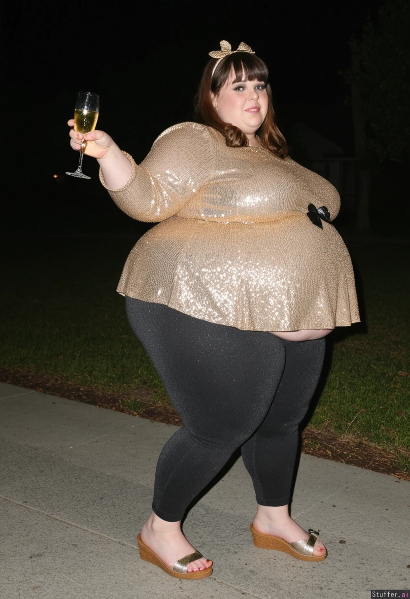 30 year old morbidly obese fat ssbbw oversized dark gold sparkled peplum blouse with sequins, oversized charcoal capri leggings, brown hair, brown eyes, bow in hair,glitter on Chubby cheeks, straightened hair, bangs, sandles, holding glass of champagne Side view New years eve outside park party Fully clothed Fully covered View from side Ultra massive fat arms Hyper fat round bloated belly sticks out far in front Ultra wide massive fat hips Hyper humongous fat thighs Side view
