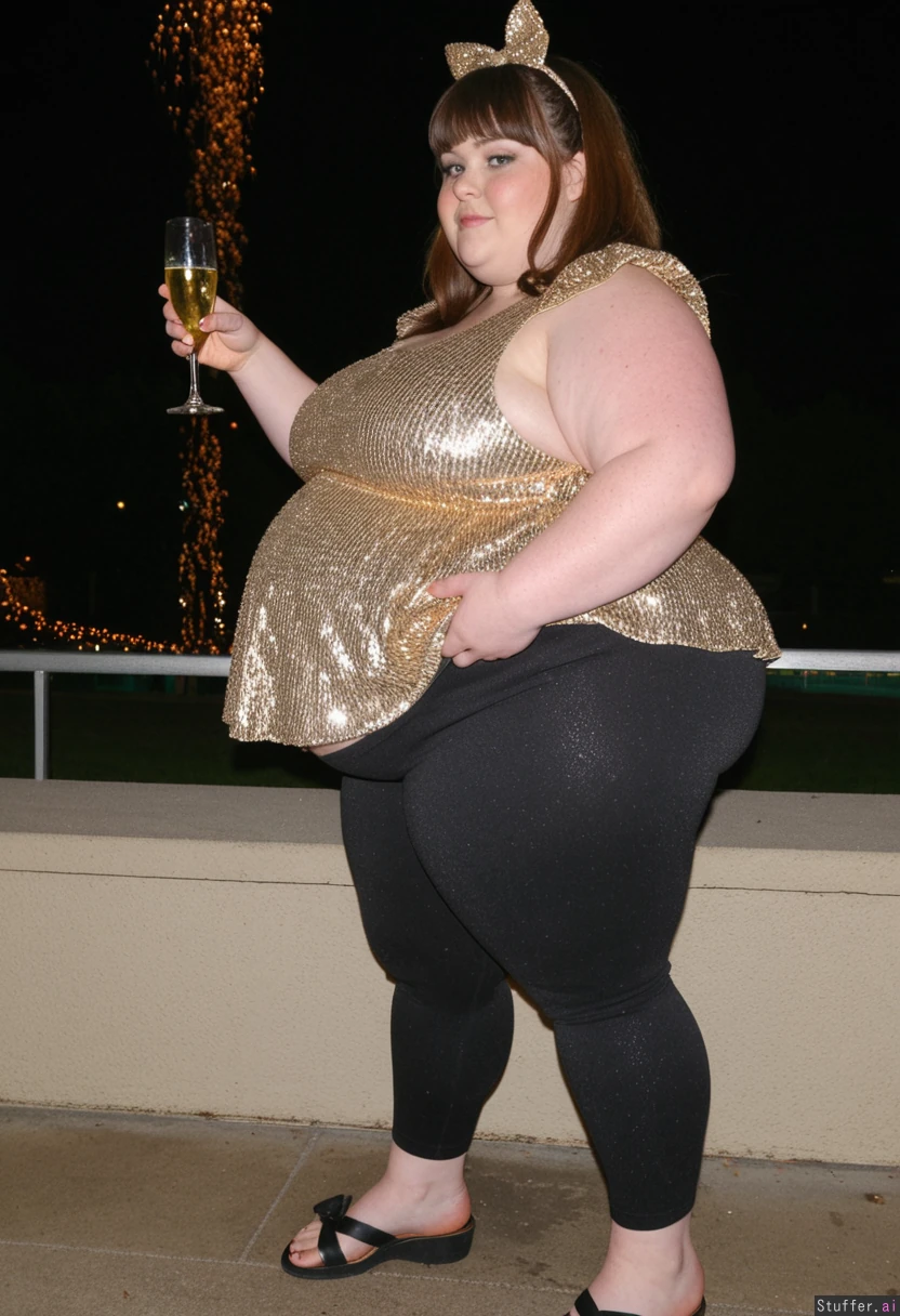 30 year old morbidly obese fat ssbbw oversized dark gold sparkled peplum blouse with sequins, oversized charcoal capri leggings, brown hair, brown eyes, bow in hair,glitter on Chubby cheeks, straightened hair, bangs, sandles, holding glass of champagne Side view New years eve outside park party with friends Fully clothed Fully covered View from side Ultra massive fat arms Very bottom heavy Hyper fat round bloated belly sticks out far in front Chubby cheeks Ultra wide massive fat hips Double chin Hyper humongous fat thighs Side view