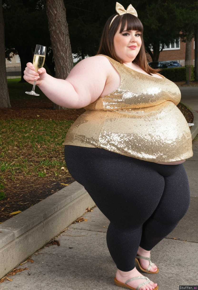 30 year old ultra morbidly obese fat ssbbw oversized dark gold sparkled peplum blouse with sequins, oversized charcoal capri leggings, brown hair, brown eyes, bow in hair,glitter on Chubby cheeks, straightened hair, bangs, sandles, holding glass of champagne Side view Daytime New years eve outside park party with friends Fully clothed Fully covered View from side Ultra massive fat arms Very bottom heavy Hyper fat round bloated belly sticks out far in front Chubby cheeks Ultra wide massive fat round hips Double chin Hyper humongous fat thighs Side view