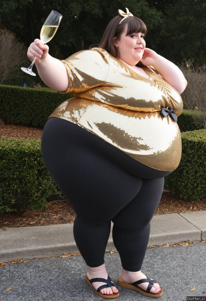 30 year old ultra morbidly obese fat ssbbw oversized dark gold sparkled peplum blouse with sequins, oversized charcoal capri leggings, brown hair, brown eyes, bow in hair,glitter on Chubby cheeks, straightened hair, bangs, sandles, holding glass of champagne Side view Daytime New years eve outside park party with friends Fully clothed Fully covered View from side Ultra massive fat arms Very bottom heavy Hyper fat round bloated belly sticks out far in front Chubby cheeks Ultra wide massive fat round hips Double chin Hyper humongous fat thighs Side view