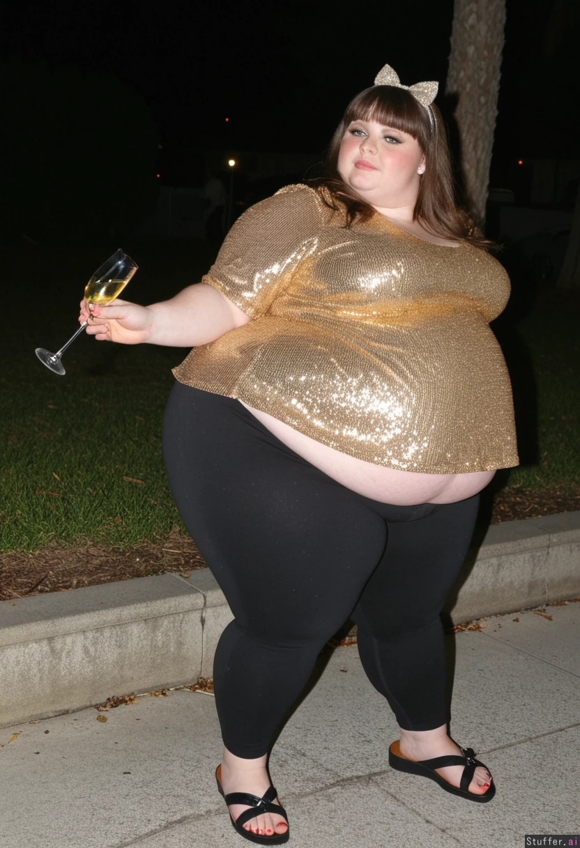 30 year old ultra morbidly obese fat ssbbw oversized dark gold sparkled peplum blouse with sequins, oversized charcoal capri leggings, brown hair, brown eyes, bow in hair,glitter on Chubby cheeks, straightened hair, bangs, sandles, holding glass of champagne Side view Daytime New years eve outside park party with friends Fully clothed Fully covered View from side Impossibly fat Ultra massive fat arms Very bottom heavy Hyper fat round bloated belly sticks out far in front Hyper chubby cheeks Ultra wide massive fat round hips Double chin Hyper humongous fat thighs Side view