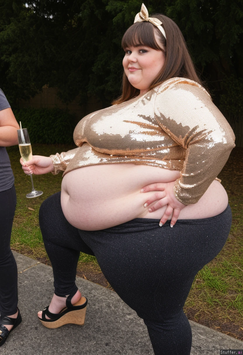 30 year old ultra morbidly obese fat ssbbw oversized dark gold sparkled peplum blouse with sequins, oversized charcoal capri leggings, brown hair, brown eyes, bow in hair,glitter on Chubby cheeks, straightened hair, bangs, sandles, holding glass of champagne Side view Daytime New years eve outside park party with friends Fully clothed Fully covered View from side Hyper Impossibly fat Ultra massive fat arms Very bottom heavy Hyper fat round bloated belly sticks out far in front Hyper chubby cheeks Ultra wide massive fat round hips Double chin Hyper humongous fat thighs Side view