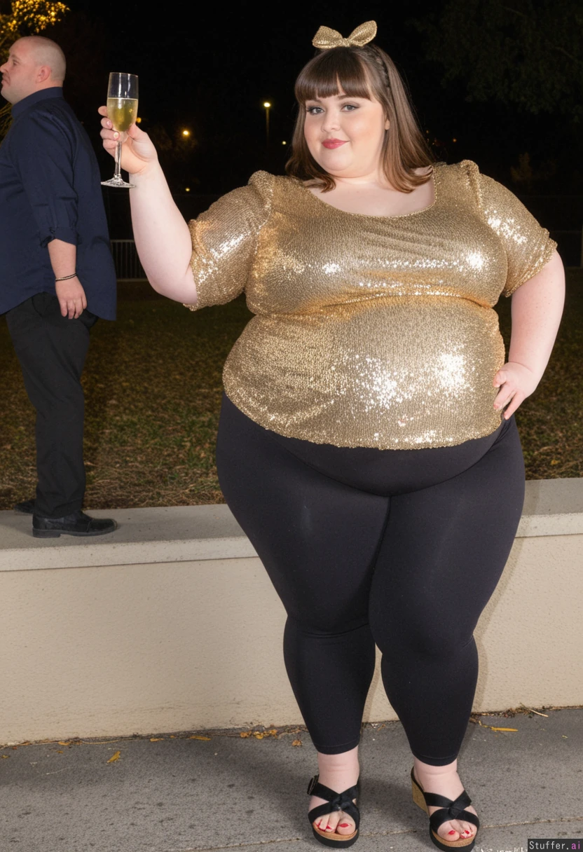 30 year old morbidly obese fat ssbbw oversized dark gold sparkled peplum blouse with sequins, oversized charcoal capri leggings, brown hair, brown eyes, bow in hair,glitter on Chubby cheeks, straightened hair, bangs, sandles, holding glass of champagne Side view Daytime New years eve outside park party with friends Fully clothed Fully covered View from side Very bottom heavy Hyper fat round bloated belly sticks out far in front Double chin Hyper humongous fat thighs Side view