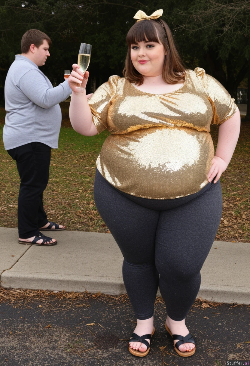 30 year old morbidly obese fat ssbbw oversized dark gold sparkled peplum blouse with sequins, oversized charcoal capri leggings, brown hair, brown eyes, bow in hair,glitter on Chubby cheeks, straightened hair, bangs, sandles, holding glass of champagne Side view Daytime New years eve outside park party with friends Fully clothed Fully covered View from side Very bottom heavy Hyper fat round bloated belly sticks out far in front Side view